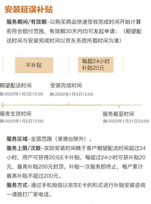 消费者在京东下单购买冰箱,但实际安装时间晚于预期的配送时间时,即可享受延迟安装补贴服务。具体而言,每超过预期安装时间的24小时,消费者将获得20元的补贴,最高可达200元封顶。