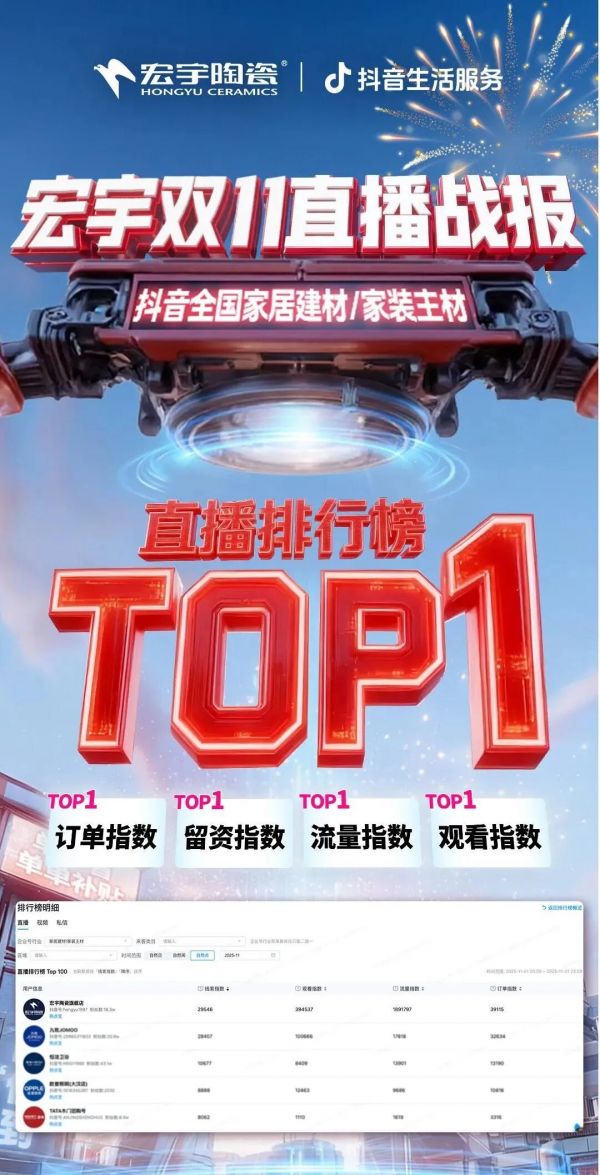 宏宇双11直播登顶抖音全国家居建材直播榜TOP1