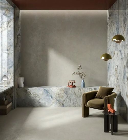 技术优势:成熟的“柔光通体”工艺,实现表里如一的纹理延伸,切割加工无色差,适用于楼梯、岛台等异形空间;表面采用纳米级微晶釉层,莫氏硬度达6级,抗污等级达5级(GB/T 3810.14),日常维护轻松;引入银离子抗菌釉料,经SGS检测抗菌率≥99%,满足母婴家庭对健康空间的需求。