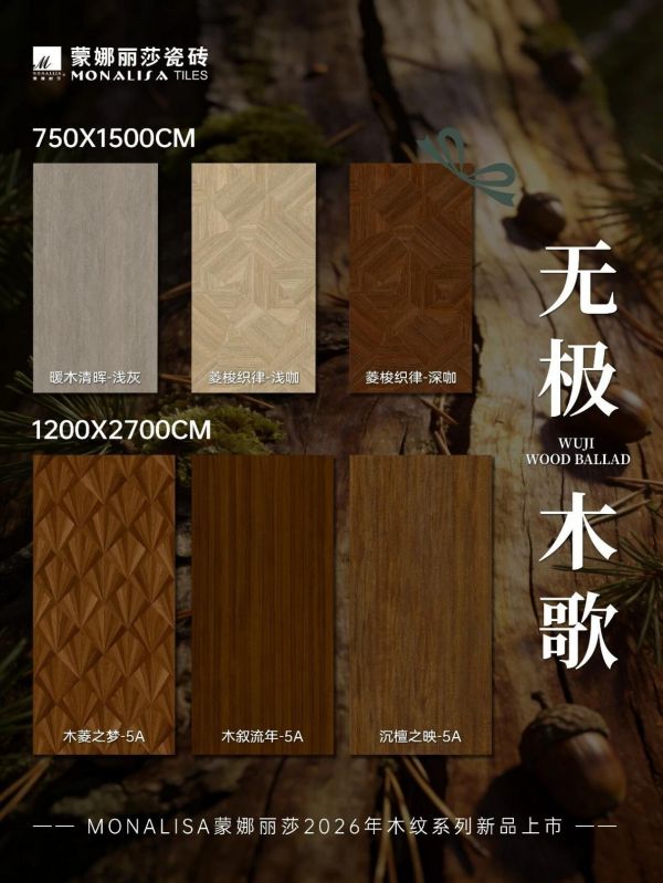 2026年,蒙娜丽莎瓷砖以 “无极木歌” 系列,精准复刻实木的自然肌理与醇厚色泽,并融入艺术化的几何拼花设计,让传统木纹在秩序与变化中焕发新生。几何结构的木纹肌理,既可在背景墙处塑造视觉焦点,亦适用于卧室等空间的整体铺陈,营造温暖而富有格调的氛围。