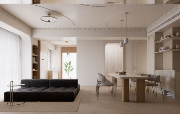 客厅空间,设计师展现了其营造空间氛围的高超技艺。整体以宁静的米白色与温暖的浅木色为基调,奠定了自然、柔和的时尚底色。中心区域的深灰色模块沙发,线条流畅而低矮,最大化释放了空间视觉感,同时围合出舒适亲密的交流场域。沙发后方,大面积的弧形落地窗是设计的点睛之笔,白色纱帘过滤后的自然光,成为空间最灵动、最珍贵的“装饰”,完美诠释了“自然时尚”的内涵。