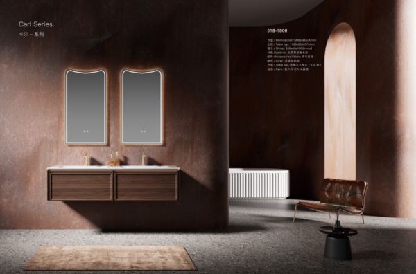 作为品牌经典高端系列,线条利落大气,搭配天然大理石,美国杜邦可丽耐,岩板一体台盆,质感拉满。柜体采用实木多层板,防水防潮性能优异,五金配件全套升级,承重与顺滑度更出色。双台盆设计适配大户型或双人卫浴场景,镜柜为嵌入式智能款,内置分区收纳格与照明系统,兼顾颜值、实用与智能,适合追求高端生活品质的家庭。