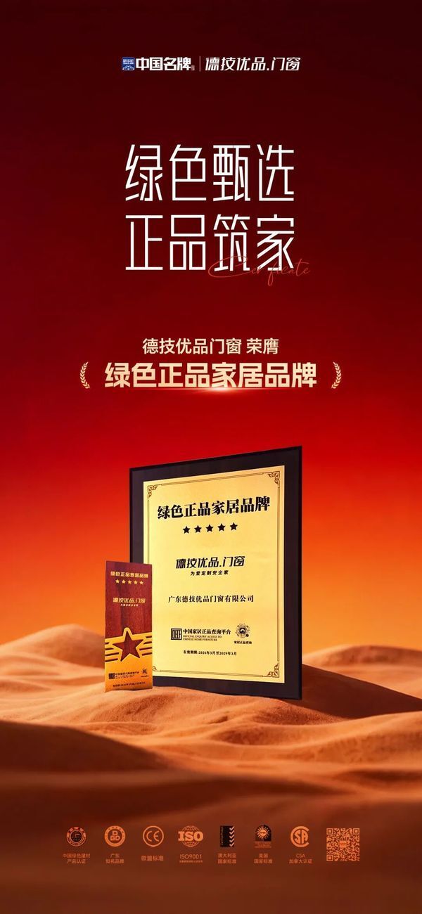 “绿色正品家居品牌”认证的获得,并非偶然,而是德技优品门窗长期坚守绿色发展理念、深耕环保领域的必然成果。作为深耕安全系统门窗领域的综合性现代化企业,德技优品始终将绿色环保贯穿于产品研发、选材、生产的全生命周期,此前已斩获多项国家级绿色权威认证,用实力践行绿色家居理念。