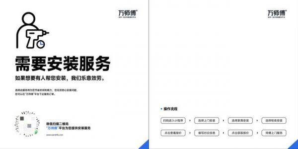 对此,万师傅提出通过“安装服务卡”一站式解决,于商品包装盒中内置“安装服务卡”,直接向消费者提供交付方案,商家无需增加售后成本,顾客也能第一时间找到专业安装师傅,零成本实现“交付有保障,售后有兜底”。