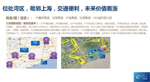 1.杭州湾世界湾区——项目位于世界湾联接口,接驳上海金山,平湖接轨上海第一站,地理位置上也是沪嘉双城生活第一站。紧邻沪乍杭铁路,实现上海杭州零距离。