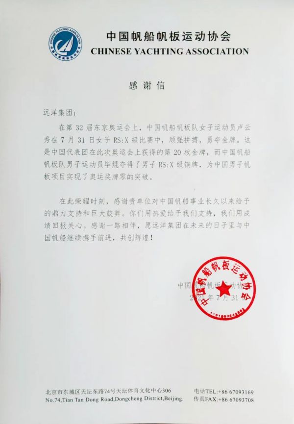 值此荣耀时刻,中国帆船帆板运动协会向远洋集团发出感谢信,对远洋长期以来对中国帆船事业的支持表达了感谢。